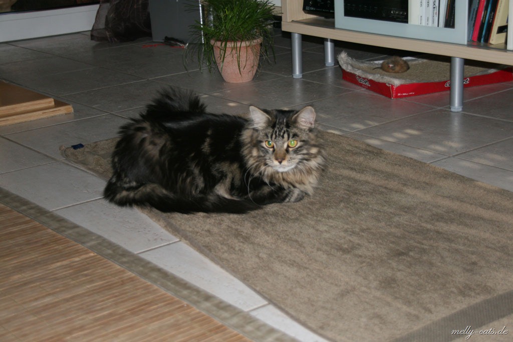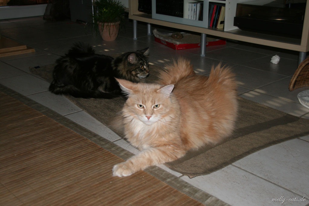 Zur Zeit ist ein kleiner Machtkampf zwischen den beiden ausgebrochen. Dieser macht sich dadurch bemerkbar, das wenn Aragon z.B. auf dem Balkontisch sitzt und Ellron ebenfalls dort raufspringt, wird Ellron von Aragon heftigst angefaucht und vertrieben. So nach dem Motto“ Das ist mein Platz, hier hast Du nichts zu suchen“. Aber wenn Ellron schon oben drauf sitzt und Aragon dann später auch darauf springt, ist Ruhe. Ich glaube Aragon versucht ihm gerade mal beizubringen, wer hier das Katersagen im Hause hat