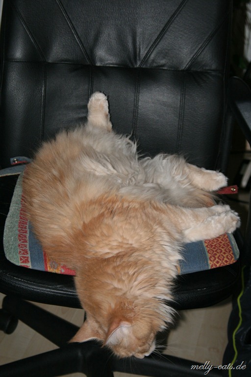 Während Aragon zur Zeit am liebesten im Arbeitszimmer meines Mannes auf seinem Stuhl sitzt. Diese Angewohnheit hat er, seit dem Azrael gestorben ist. Am Anfang fand mein Mann es ja lustig, das er immer auf seinem Stuhl liegen wollte (obwohl so schlimm kann es nicht sein, denn mein Mann nimmt sich immer freiwillig das Höckerchen und sitzt dann dort, obwohl der Hocker sehr unbequem ist). Jetzt hat Aragon auch schon eine Strategie entwickelt, um sich seinen Lieblingsplatz zu ergattern