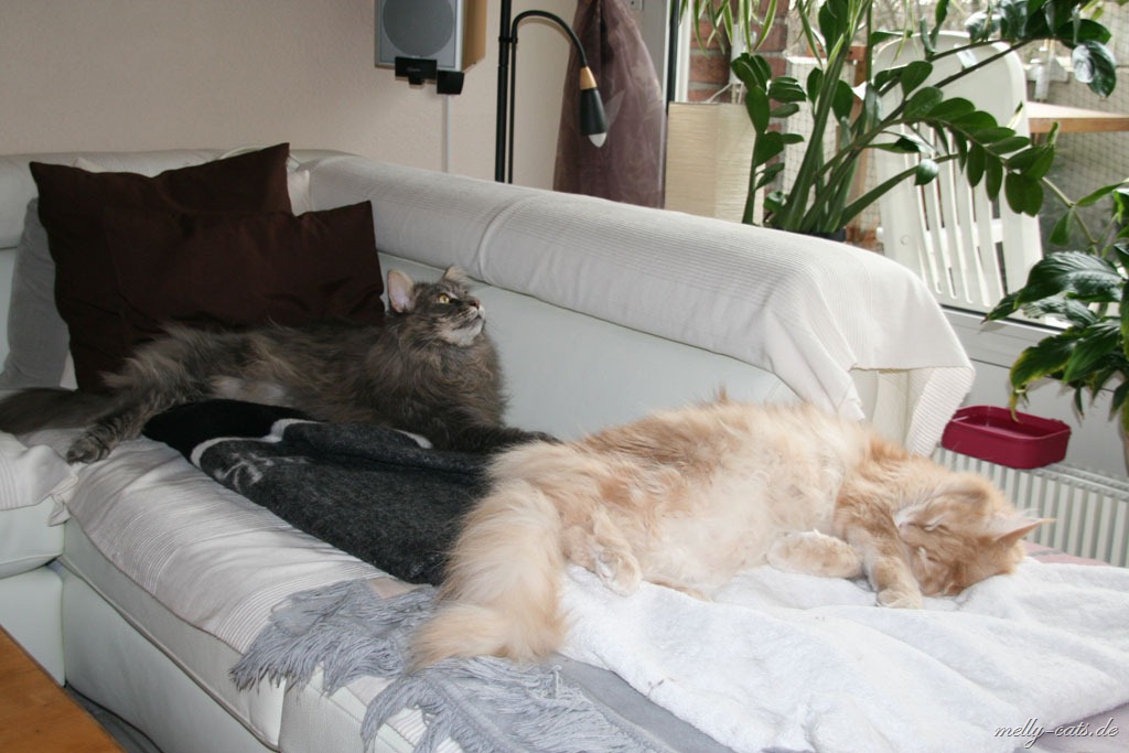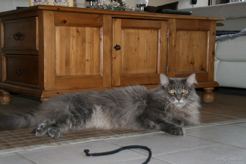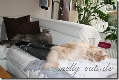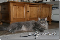 Jedoch ist Carry kurz danach ins Schlafzimmer gewandert und irgendwann wollte Aragon mal schauen wo er hin ist, Carry lag in seiner Höhle und Aragon hat sich davor gelegt. Tja, Carry fing dann an zu fauchen, klar, sah der große Kerl ja keinen anderen Ausweg mehr Zwinkerndes Smiley. Mit Ellron versteht er sich schon super. Die beiden spielen sogar miteinander Zwinkerndes Smiley. Ellron läuft beiden immer hinterher, er rennt nur noch durch die Wohnung und sucht einen von beiden, damit sich immer wenigstens einer um ihn kümmert Smiley.