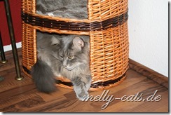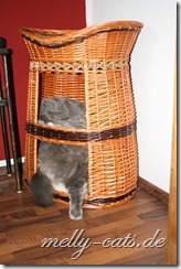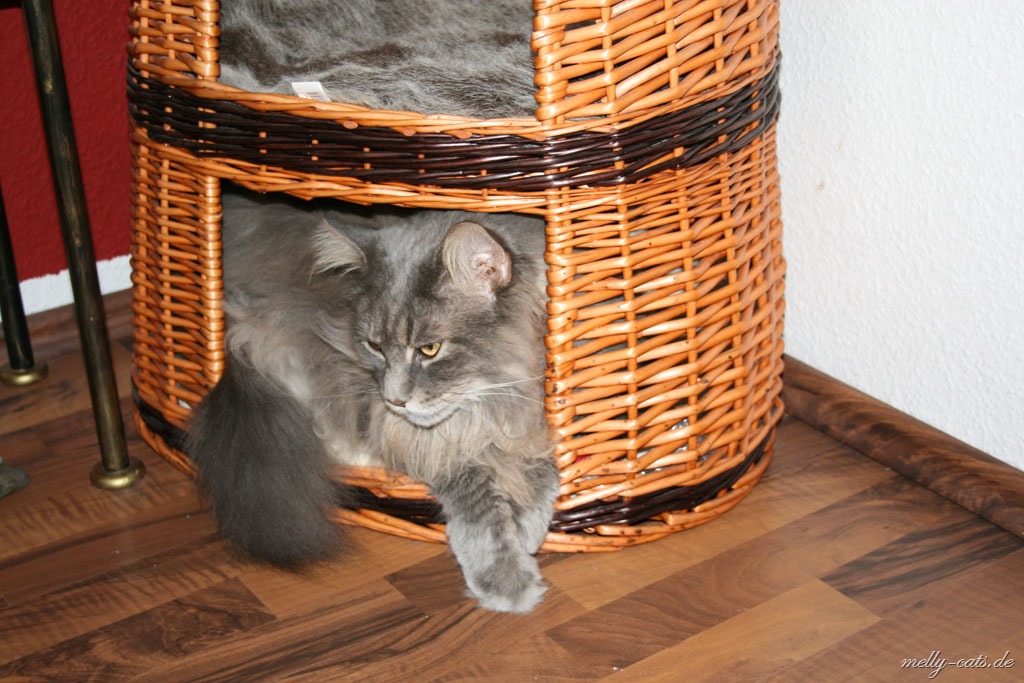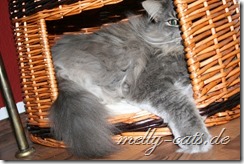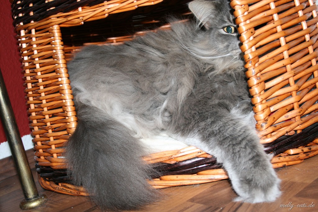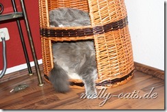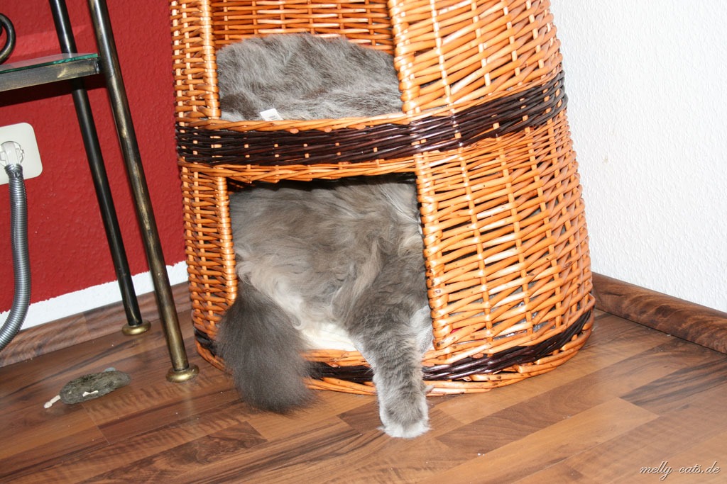@Marlene, na ja, unten liegt ein riesiges, dickes Kissen drin, weil die den Korb irgendwie nicht so gerne nutzen. Und dann quetscht sich Carry da auch noch rein, obwohl durch das riesige Kissen kein Platz mehr darin ist