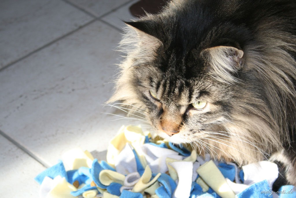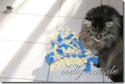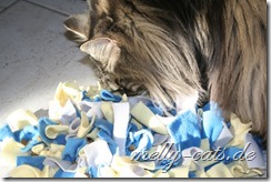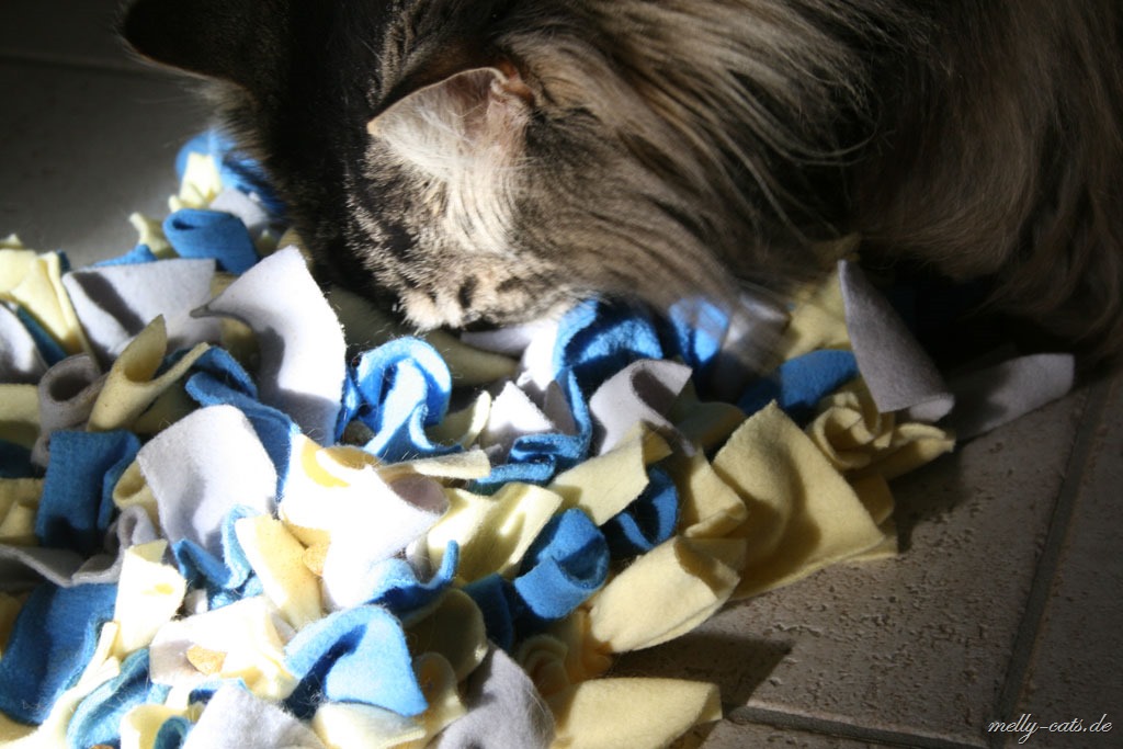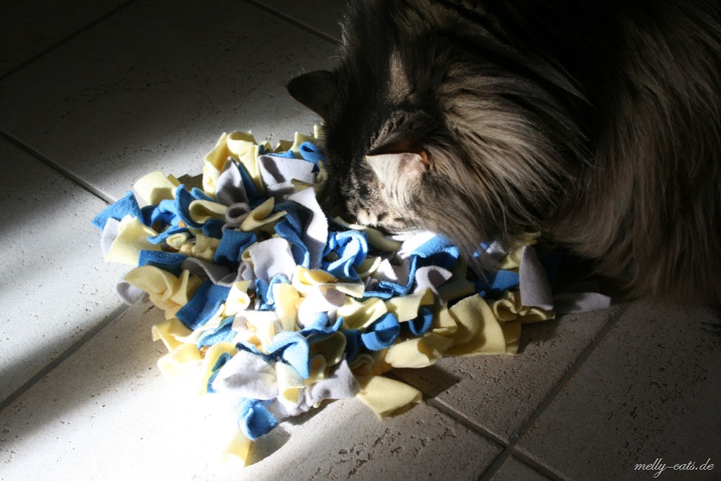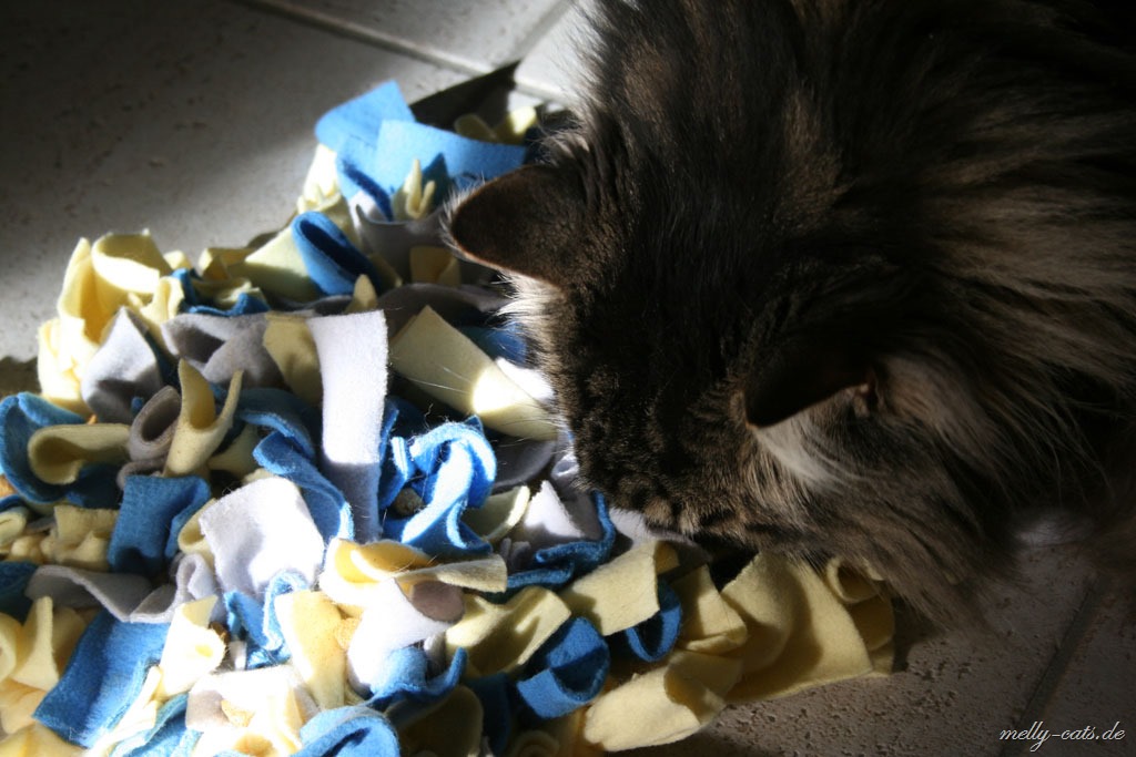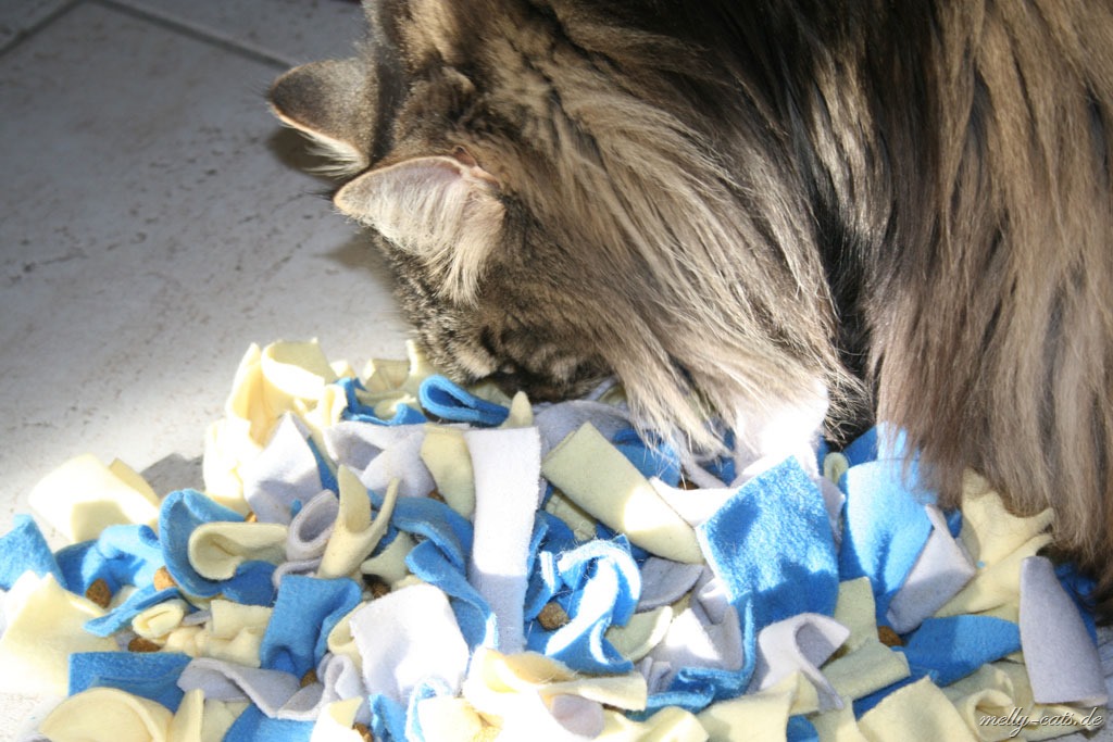 Ellron liebt diesen Schnuffelteppich abgöttich. Er ist ja jetzt auf Diät, also wir haben wieder angefangen, leider ohne Waage, aber egal. Somit bekommt er jetzt immer 1 Dose Nassfutter von Hills´s Metabolic und ca. 20 g Trockenfutter. Dann darf er pro Tag noch ca. 10-15 g Trockenfutter nebenbei haben. Diese fülle ich ihm in den Schnuffelteppich, da muss er sich wenigstens ein wenig anstrengen ;)