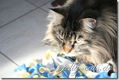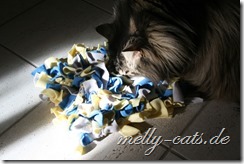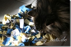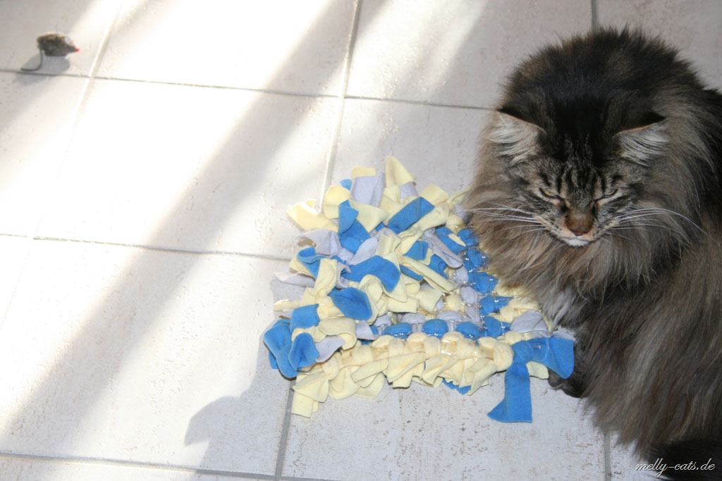 Und unser Ellron ist ganz schön schlau, wenn es ihm zu lange dauert, dann nimmt er den Teppich und schmeißt ihn hoch in die Luft, so dass die Trofu-Stückchen rausfallen ;). Das kann man auf dem letzten Bild erkennen, da hat er den Teppich kurz mal umgedreht :).