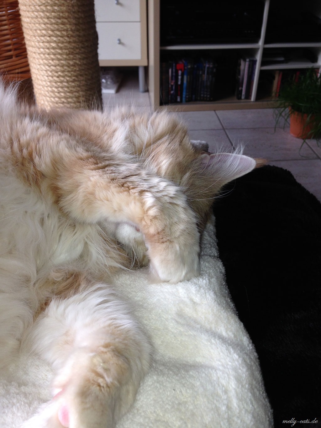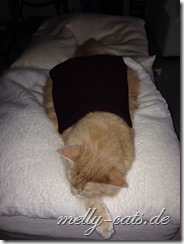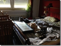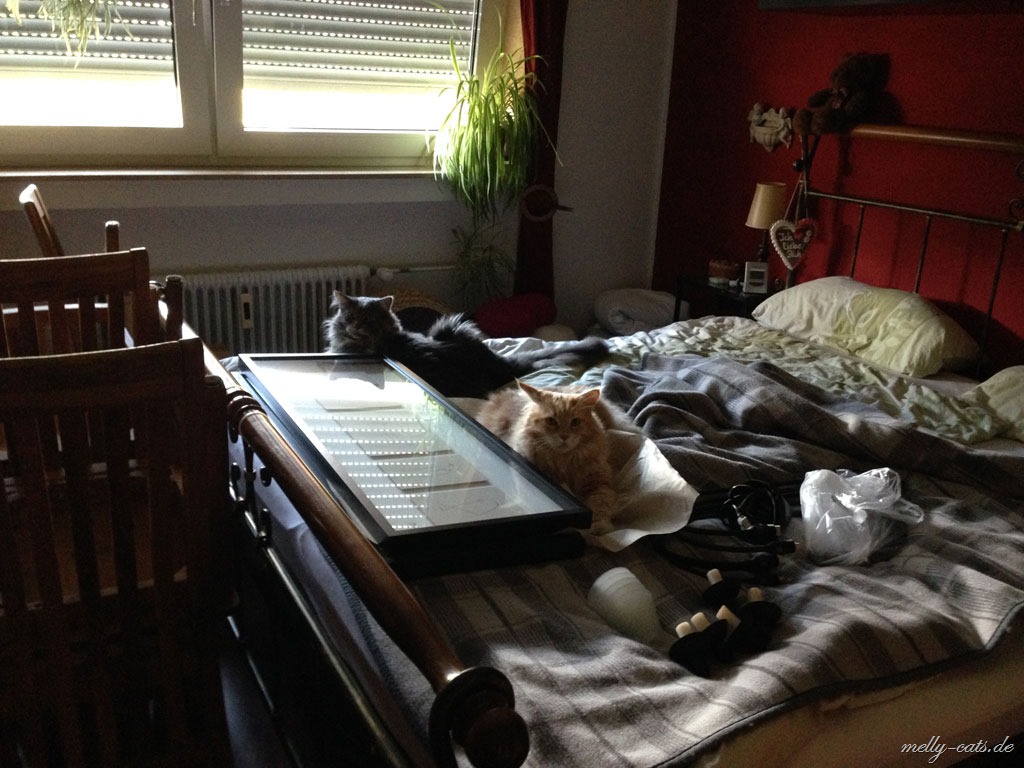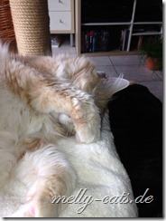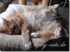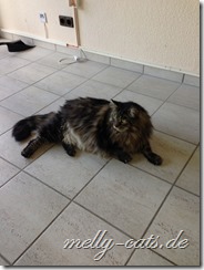 Spielfaul ist die Bande geworden, soll heißen, wenn ich sie zum spielen animieren will, sitze ich umgeben von 3 Katern, aber keiner der dreien bewegt sich… mein Mann sagt dann immer:”Na, spielst du wieder mit dir alleine?”, ja, das scheint wohl so ;). Also, als sie noch Jungspunde waren, da haben sie hier fast die Wohnung abgerissen und mit allem gespielt, was nicht niet- und nagelfest war. Jetzt sitzen sie da und gucken mich blöde an ;).