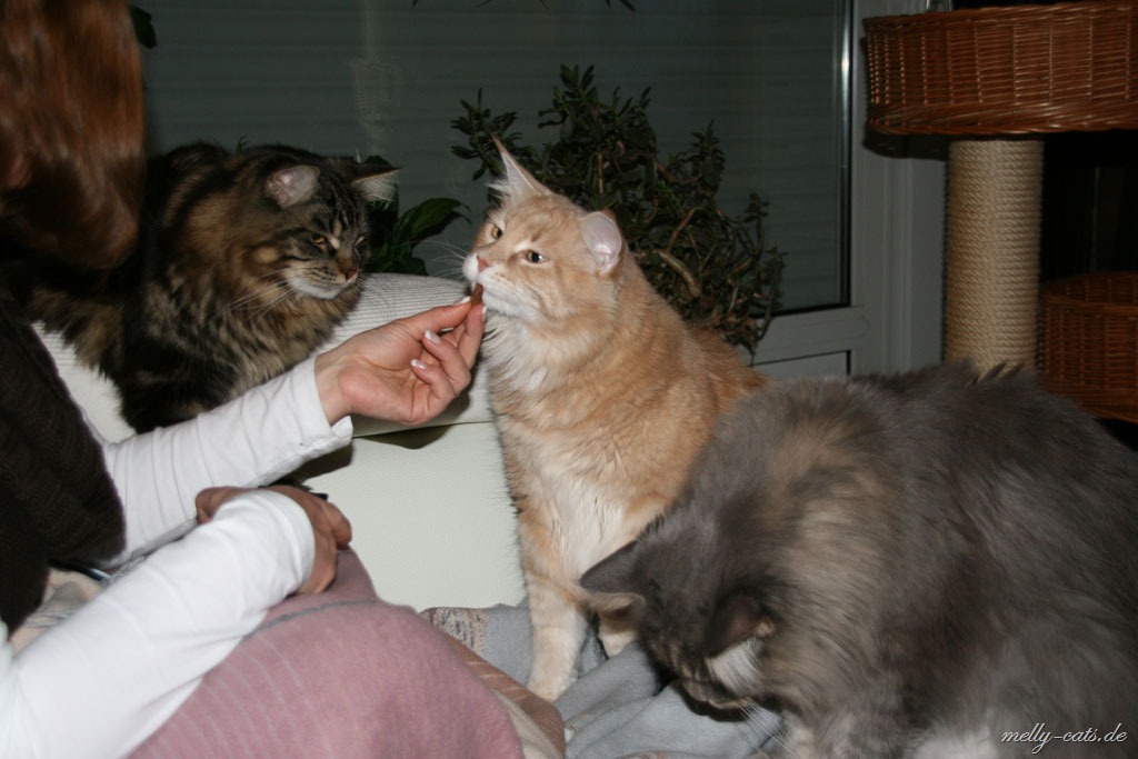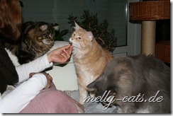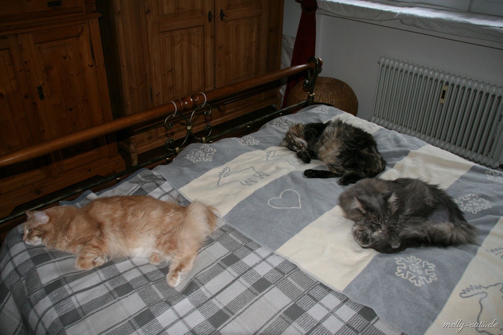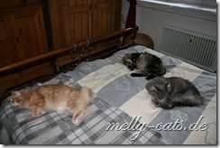 Hier mal ein Foto, wo ich sagen würde: “Hey ihr Drei, es klappt ja doch wenn man will”. Das Fauchen und Knurren, was ab und an hier noch herrscht; besonders nachdem Carry vom Tierarzt kam; ist doch alles nur Anstellerei