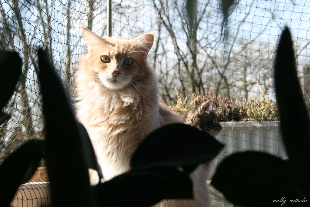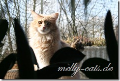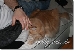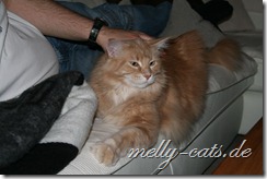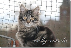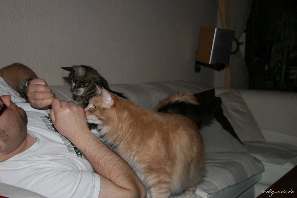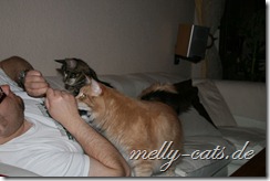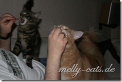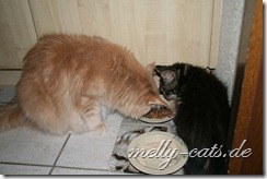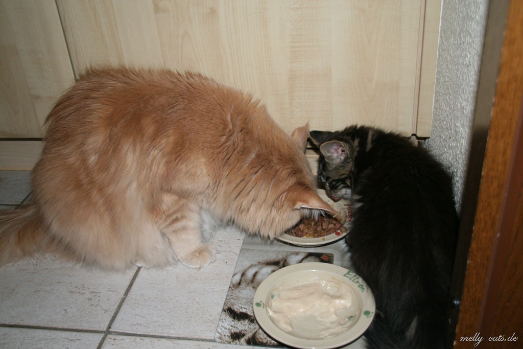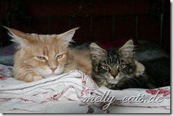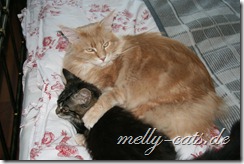 Die beiden machen sich total gut, vor 3 Tagen sind sie sogar zusammen auf´s Klöchen gegangen, obwohl ich immer dachte das machen nur wir Frauen ;). Und sie haben zusammen im Kratzbaum in einer Mulde gelegen, obwohl das werden sie nicht lange machen können, da Ellron ja auch noch groß wird. Aber es ist einfach nur zu niedlich die beiden zu beobachten.