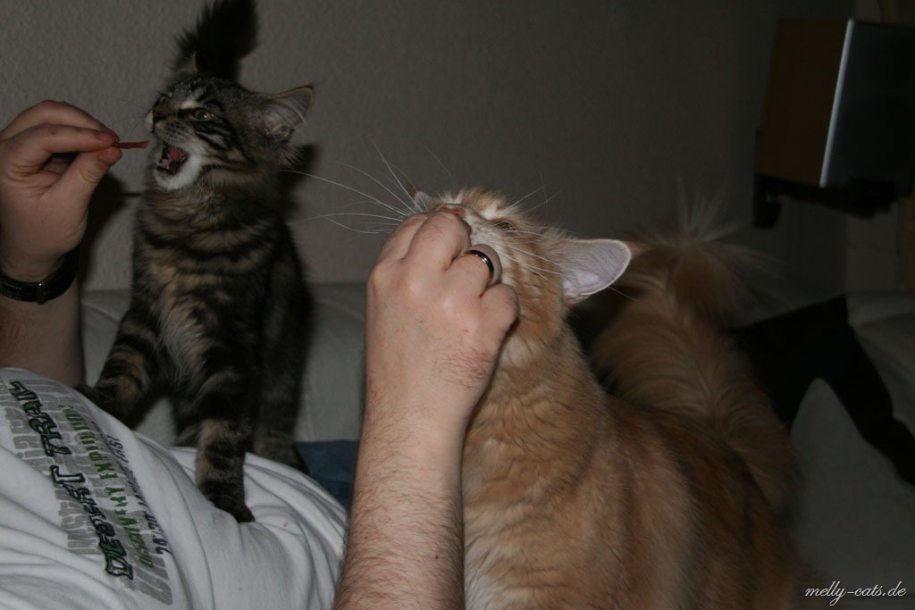 Als Azrael noch bei uns war, hat er jeden Tag sein Leckerchen eingefordert, welches er natürlich auch von uns bekommen hatte. Aragon fängt seit kurzem auch an es jeden Tag einzufordern. Wir sind von den Aldistängchen abgekommen und ich habe ihnen jetzt Miamor Cat Confect Chicklets geholt, die sind zu 100 % aus Huhn oder Ente oder Schinken und ohne diesen blöden Zucker oder andere Zusatzstoffe. Diese neuen Stängchen werden hier heiß geliebt und ich glaube sogar, das die beiden dafür töten würden ;)