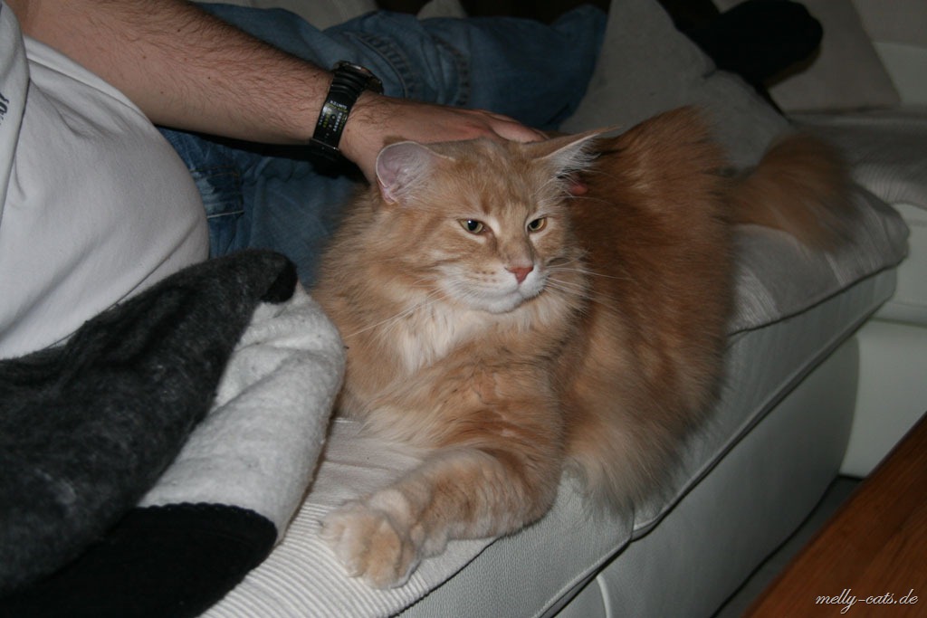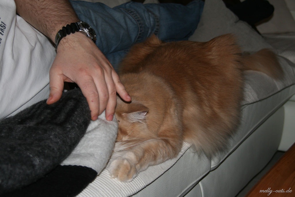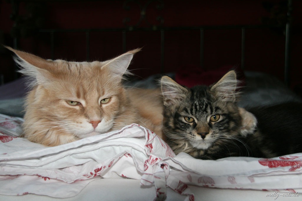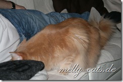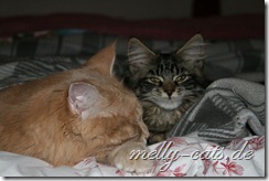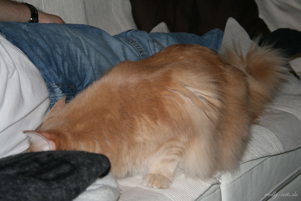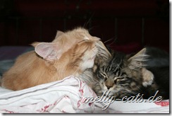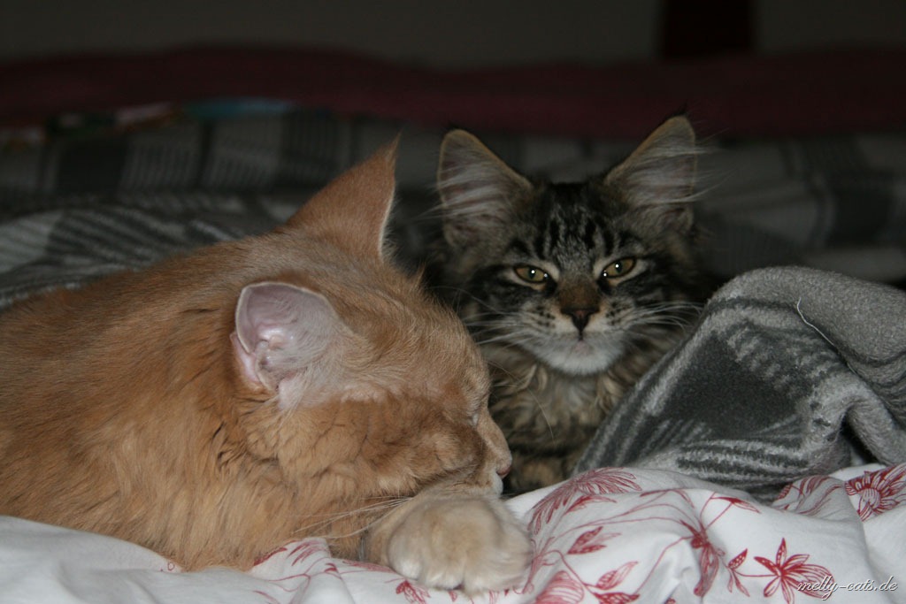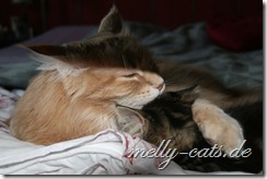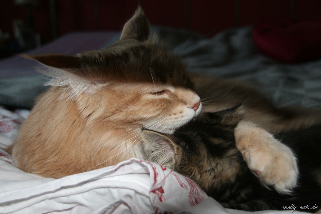 Gestern hab ich so gelacht, es war aber auch zu süß :). Aragon und Ellron haben den ganzen Nachmittag auf dem Bett aneinander gekuschelt gelegen und geschlafen. Als Aragon aufgewacht war, fing er an Ellron zu putzen. Ellron hat daraufhin angefangen total laut zu schnurren und sein Köpfchen die ganze Zeit entlang Aragons Bauch bewegt und sich durch das dichte lange Fell gewuselt. Es sah wirklich so aus, als ob er noch die Zitzen seiner Mutter suchen wollte :). Irgendwann hat er dann wohl eine beim Aragon gefunden und versucht zu trinken, keine Ahnung, aber Aragon ist dann ganz verstört aufgesprungen und hat ihn nur verdattert angeschaut :).
