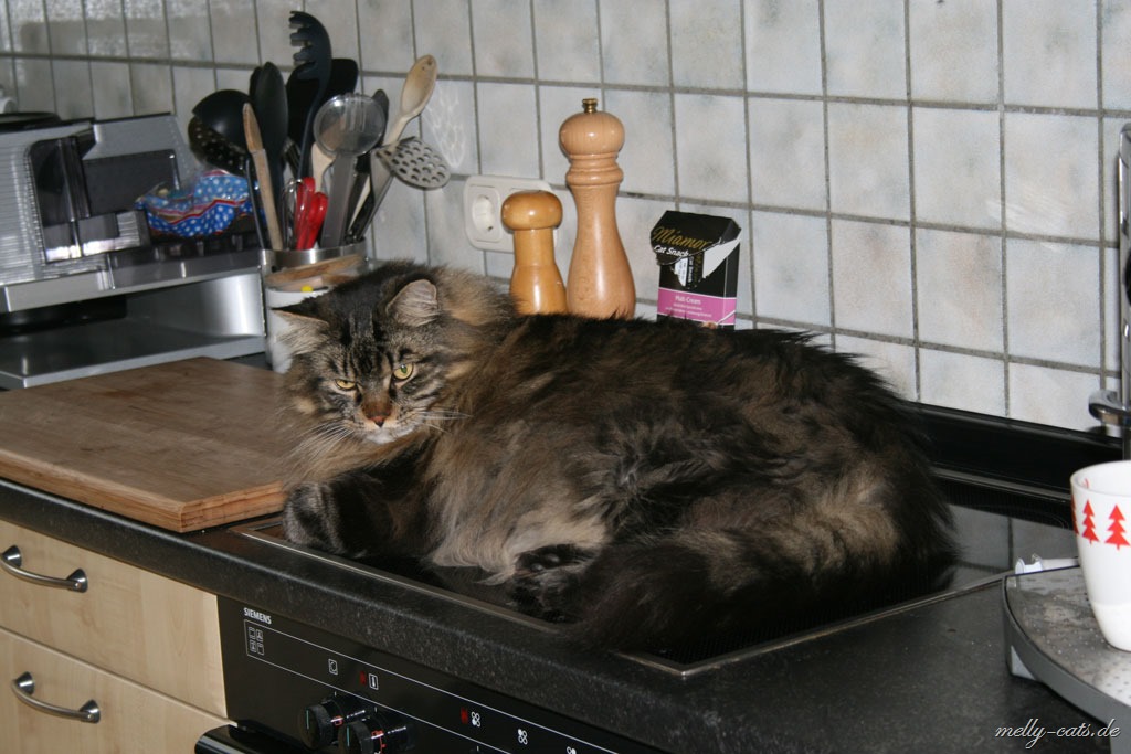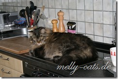 Ungeheuerlich ;). Besonders, als ich den Herren von der Arbeitsplatte runter geschmissen hatte und die Türe wieder zugemacht habe, meinte er doch tatsächlich diese wieder aufzumachen und sich prompt wieder so hinzulegen ;). Ich bin fassungslos ;), muss aber zugeben mit einem zwinkernden Auge, weil er sonst viel zu faul war, um überhaupt auf die Küche zu springen ;).