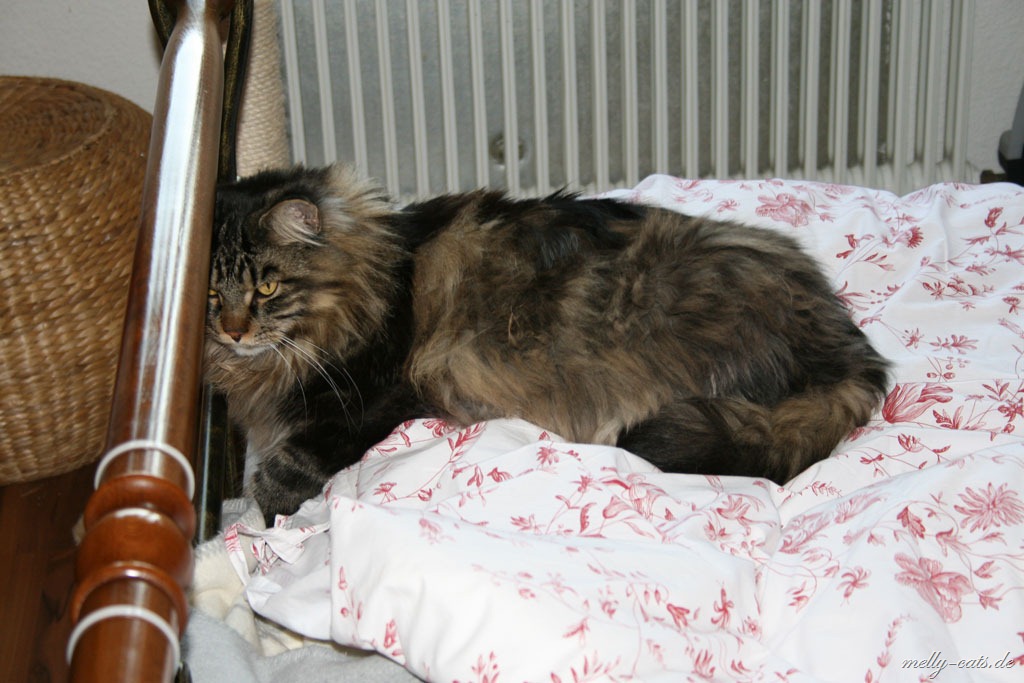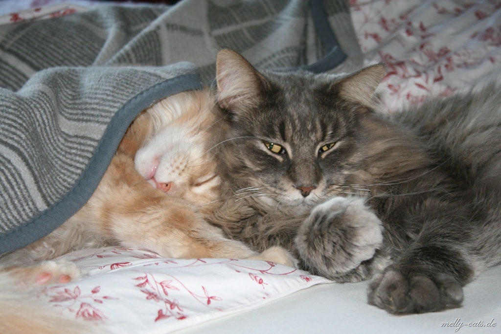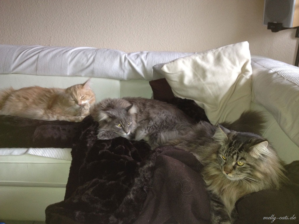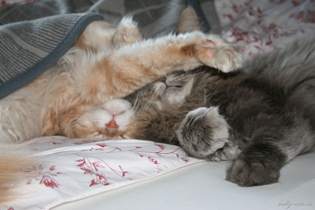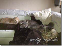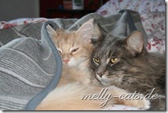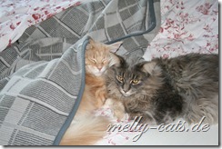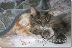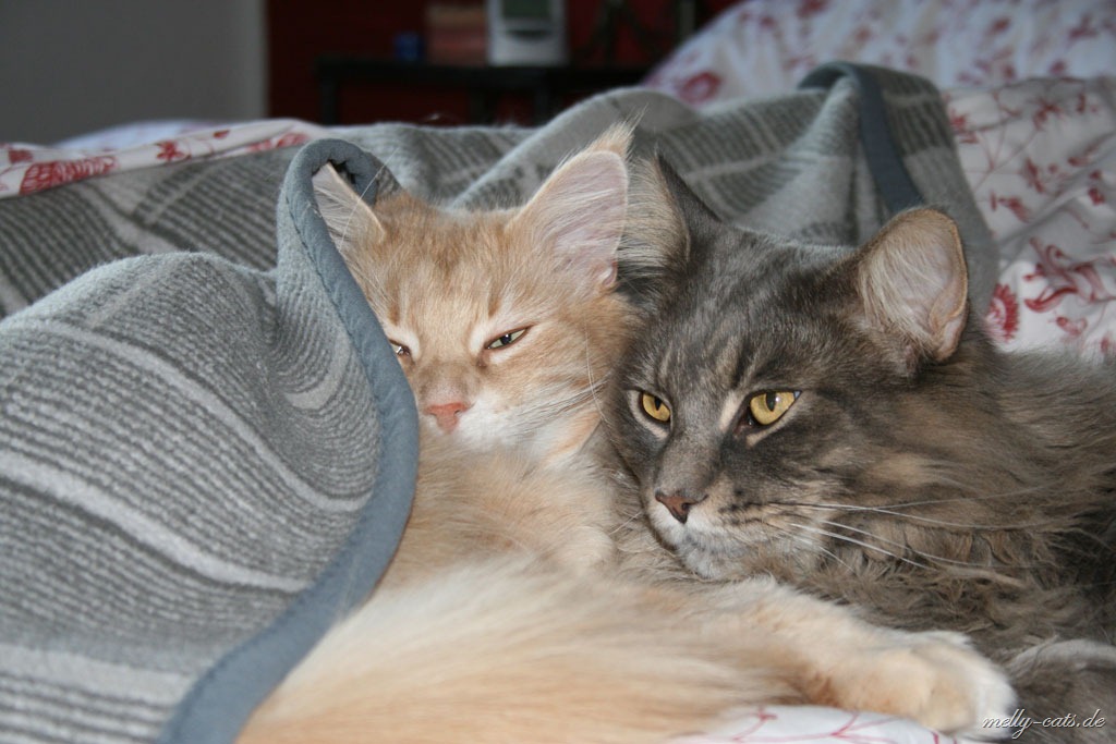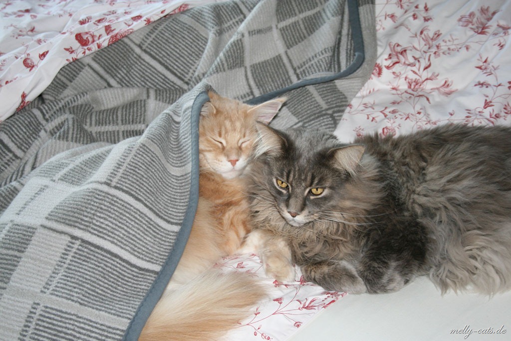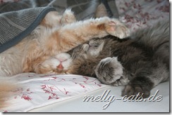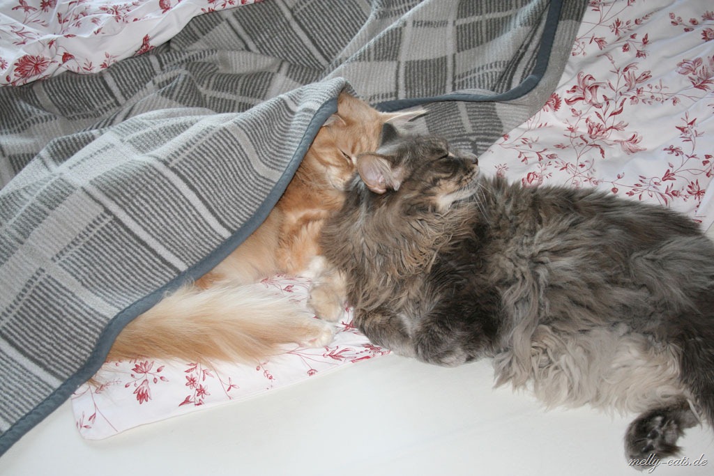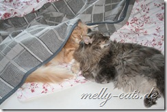 Also, die beiden Großen scheinen uns ja hier wirklich zu veräppeln, wo man daneben steht. Abends einen auf Macho machen und Morgens liegen sie zusammen, als wären sie die dicksten Freunde. Versteh einer mal die beiden. Worüber mein Mann sich natürlich sehr freut, so kann er mir jetzt immer sagen: “Ich konnte das Bett leider noch nicht machen”. Sei´s drum, da er zur Zeit ans Haus gebunden ist, konnte er diesen tollen Moment auch mal aufnehmen, worüber ich mich sehr gefreut habe, da solche Fotos von Aragon und Carry leider bis dato noch nicht existierten: