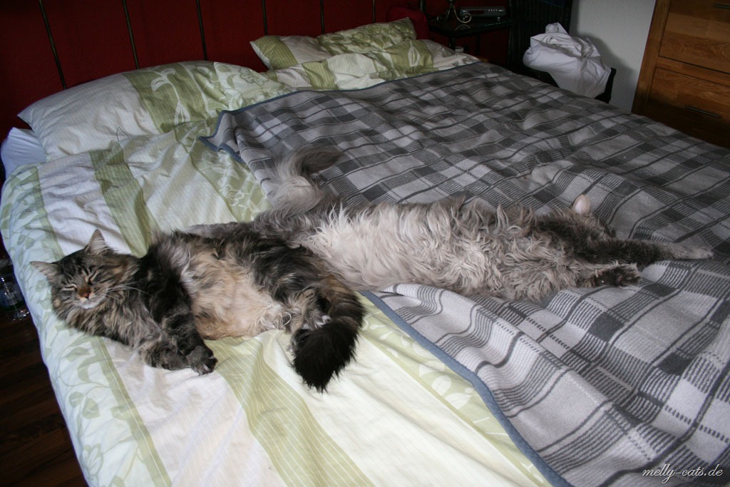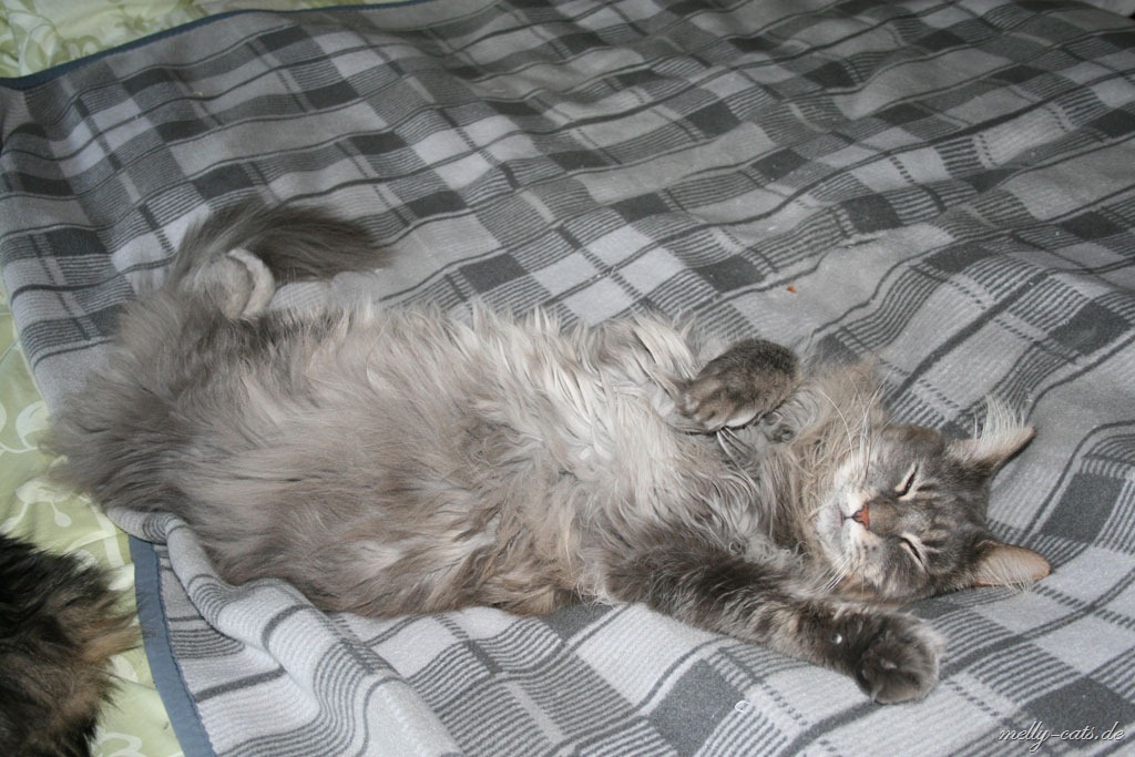 Er kommt rein, fängt an zu schnurren und läuft dabei meinem Mann um die Beine und hin und her und irgendwann steht mein Mann auf, damit er ihn streicheln kann und schwups, schon sitzt Aragon auf seinem Platz, dabei handelt es sich um Sekunden ;). Auch wenn er sonst so träge und faul ist, wenn´s um seinen Lieblingsplatz geht, dann wird er Speedy ;). Obwohl ich ja sagen muss, das Aragon in den letzten paar Monaten ganz schön abgenommen hat. Ich habe ihn gewogen und er hat nur noch 9 kg. Das sind knapp 700 g weniger. Und man merkt es ihm auch an, da er seit einigen Wochen auch wieder viel spielt und sich bewegt. Aber ganz ehrlich, weniger darf es nicht werden. Man fühlt schon jetzt jeden einzelnen Wirbel und sein Kastratenbäuchlein wabbelt jetzt noch mehr beim rennen ;).