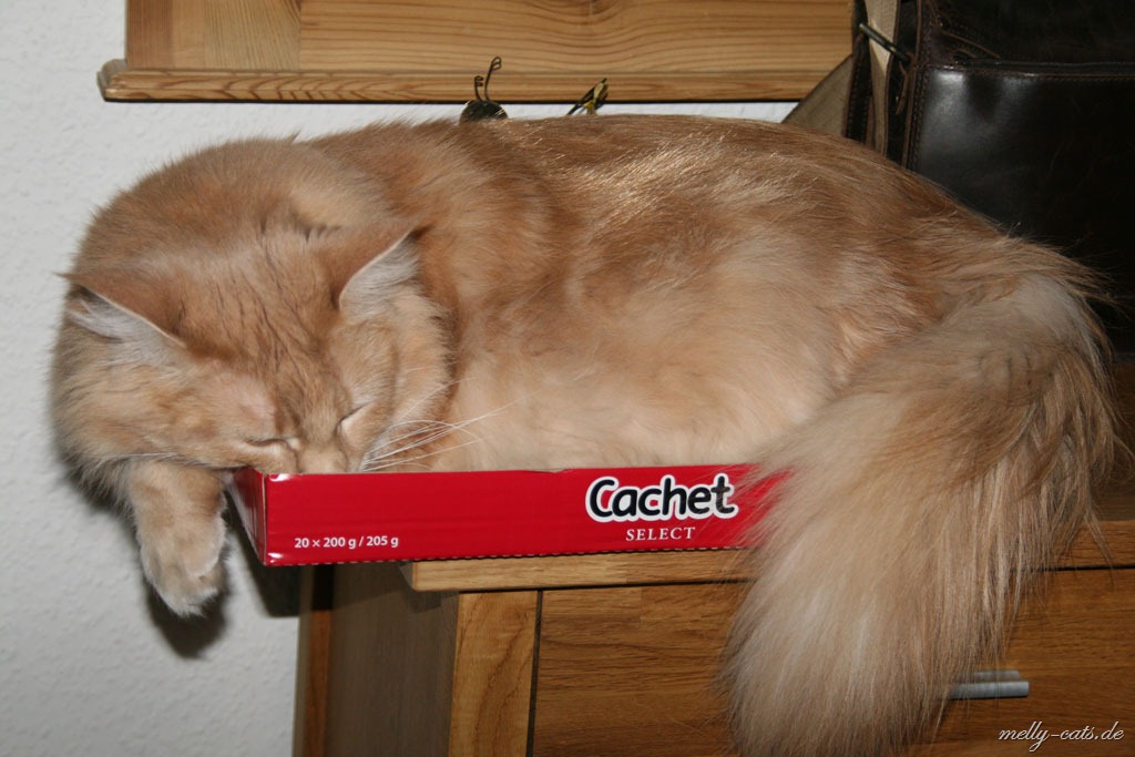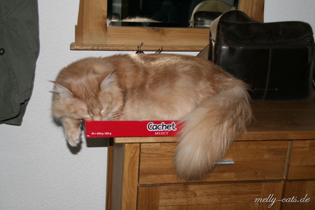 . Er schläft tief und fest und ich hoffe nur, das die Pappkiste nicht runterkippt bei dem Gewicht ![]()