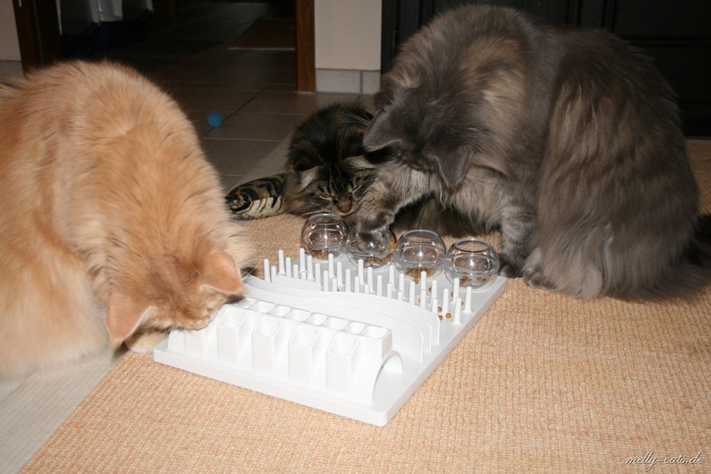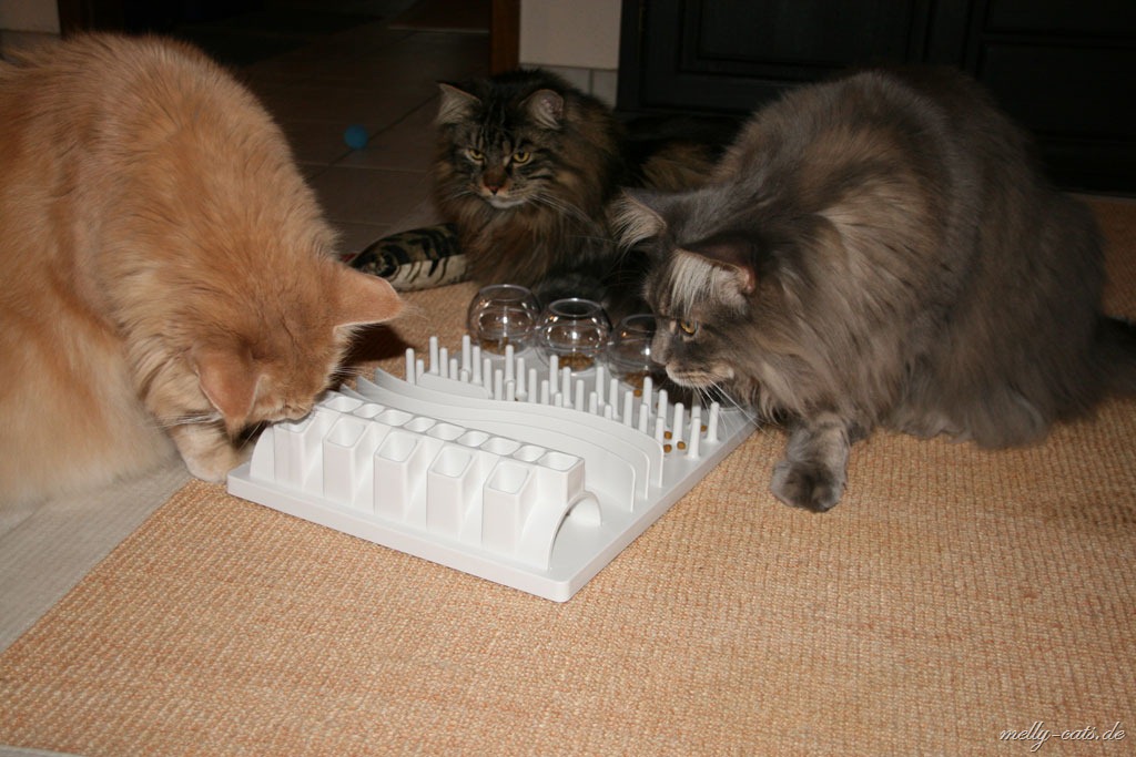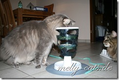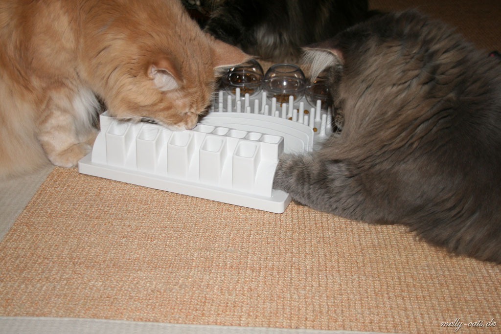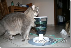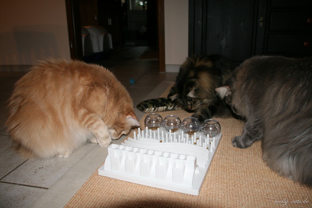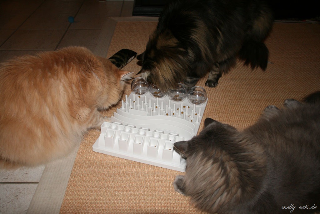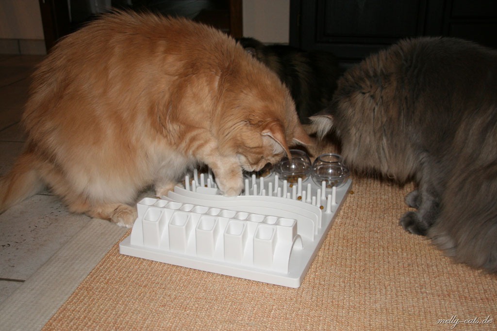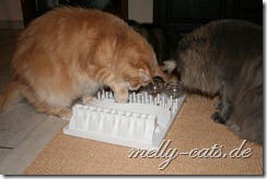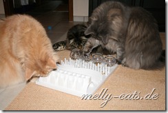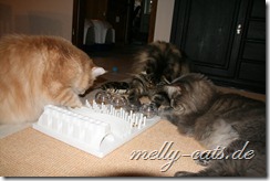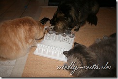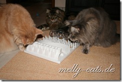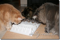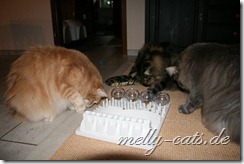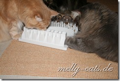 Nachts, wenn alles ruhig ist, dann hört man immer irgendeinen der an dem neuen Brett sitzt und ein wenig nach den Leckerchen fummelt. Einzig Carry große Pranken passen leider nicht so richtig durch die schmalen Ritzen, so dass er aber sehr schnell gelernt hat, sich die Leckerchen aus den Glasschalen zu angeln oder aus dem Mauseloch zu holen. Ellron mag am liebsten das “Zungenspiel”, da kann er nur mit der Zunge die Leckerchen bekommen. Also für jeden ist was dabei. Ich würde sagen, diese Investition hat sich bezahlt gemacht und die Melly-Cats werden ab heute fit und das nicht nur körperlich (hoffe ich ) ;).