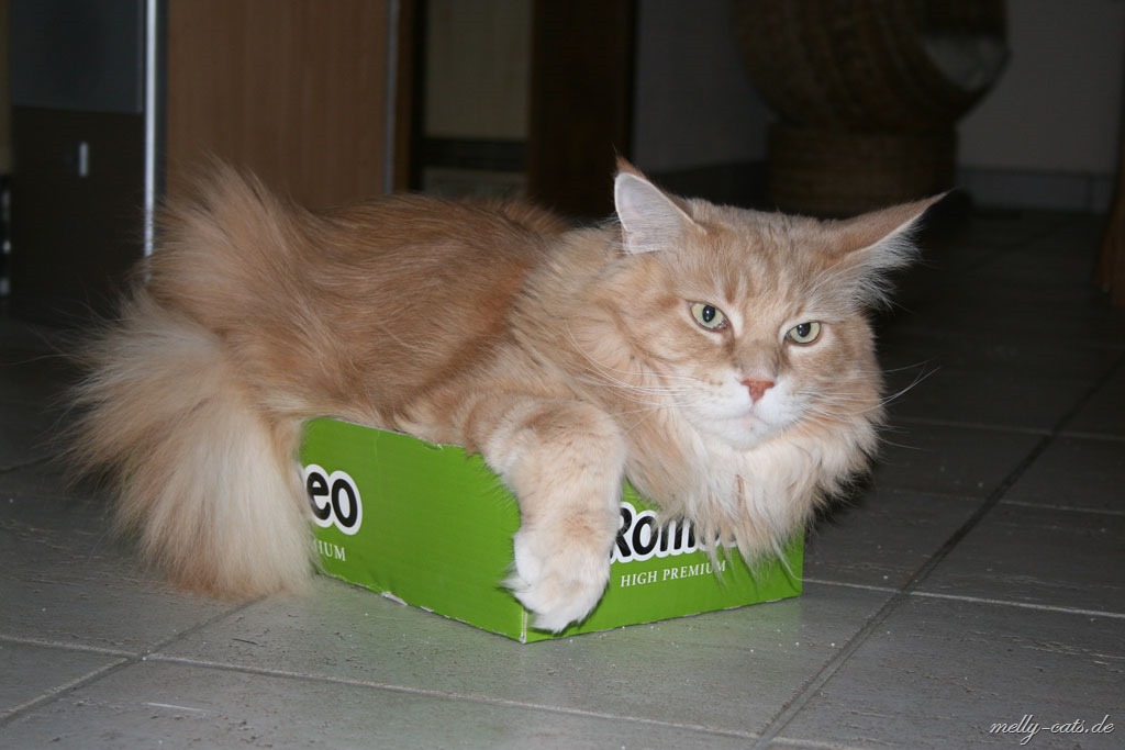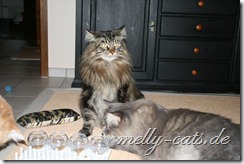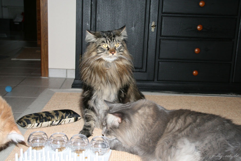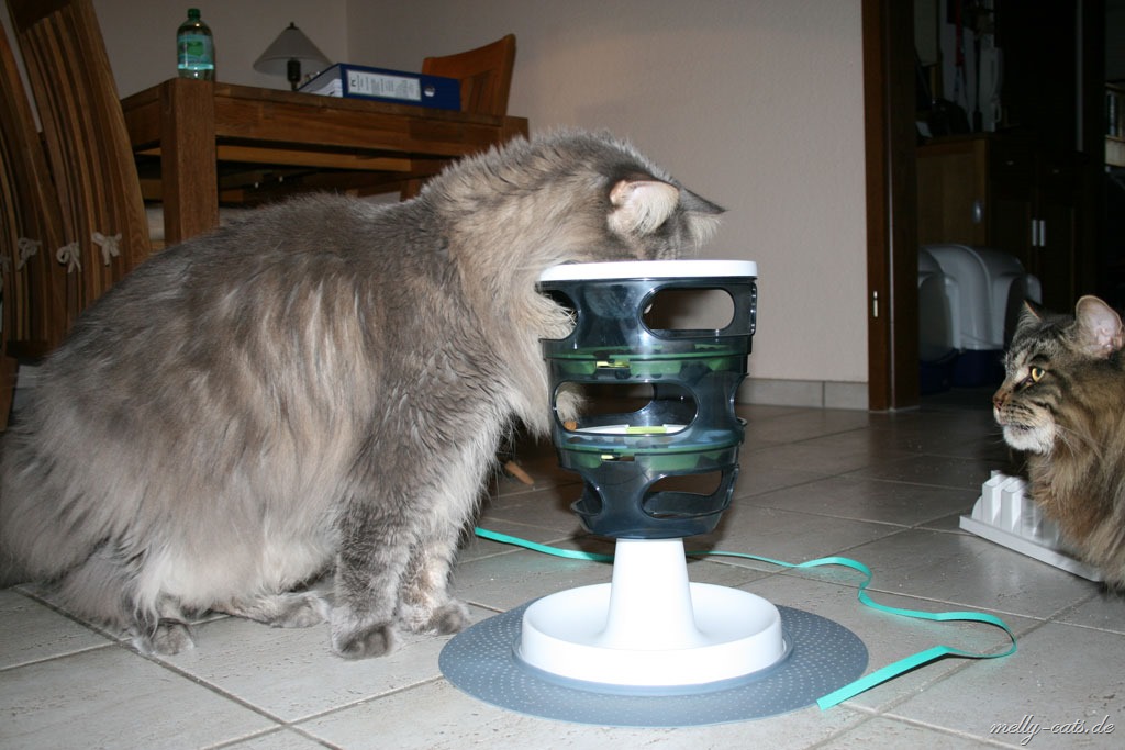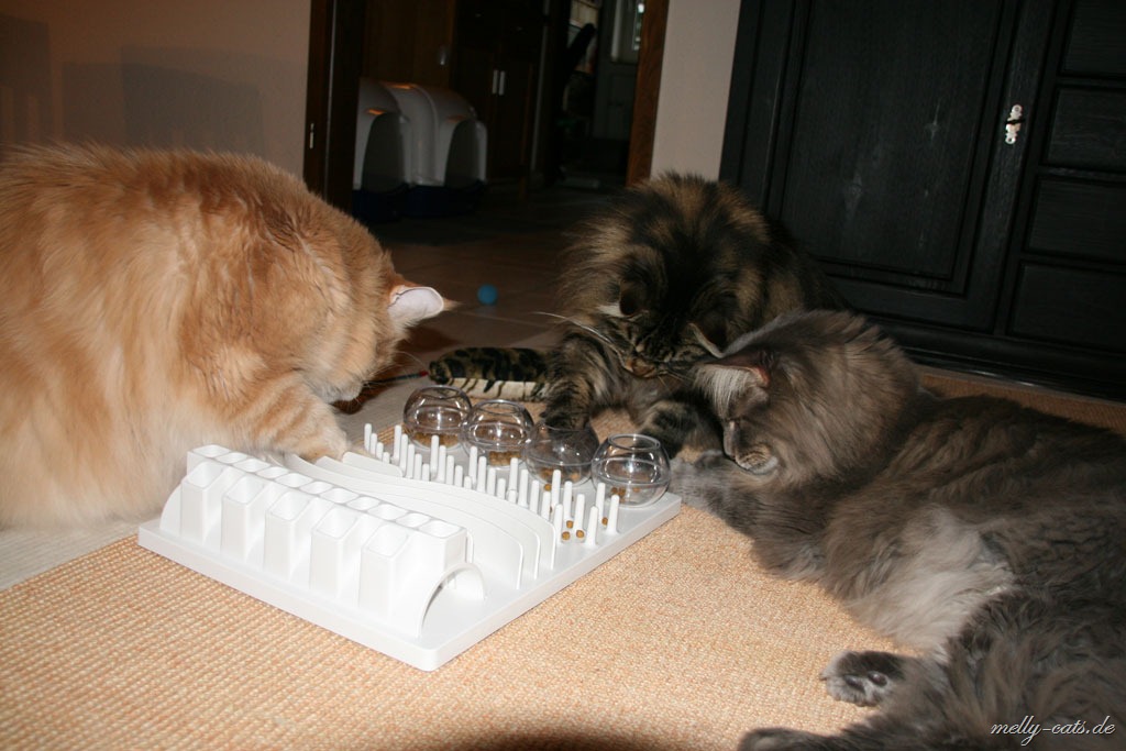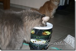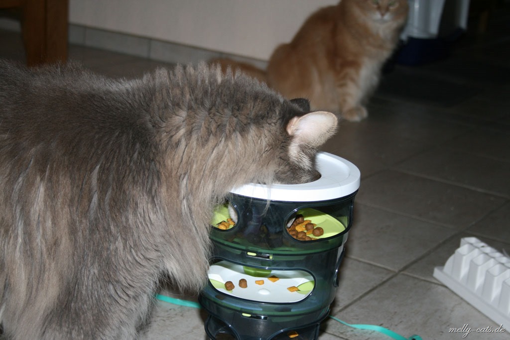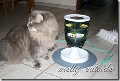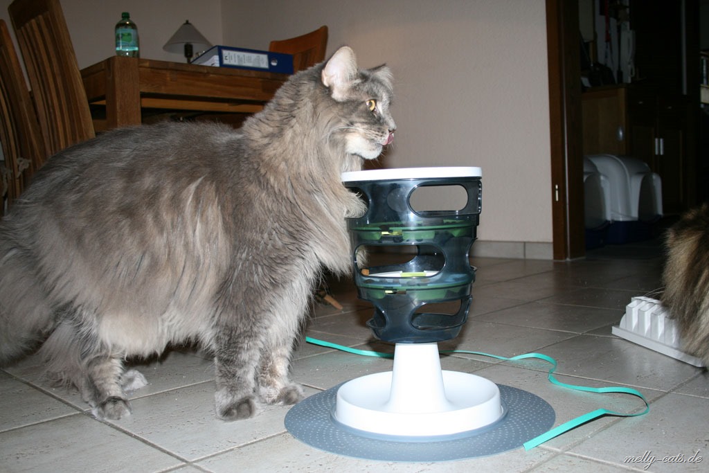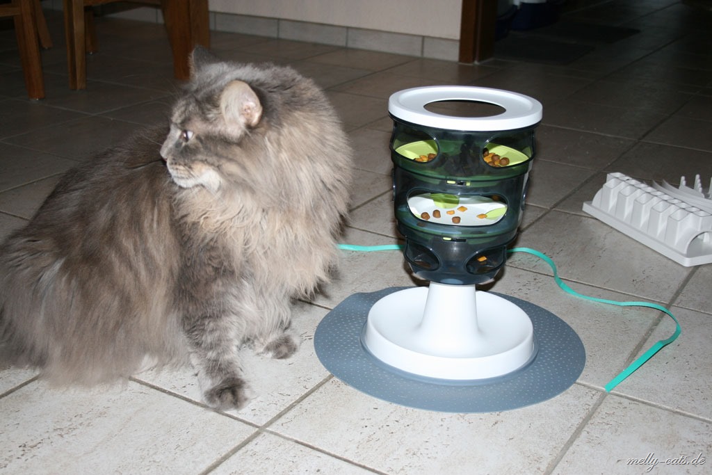 Nachts, wenn alles ruhig ist, dann hört man immer irgendeinen der an dem neuen Brett sitzt und ein wenig nach den Leckerchen fummelt. Einzig Carry große Pranken passen leider nicht so richtig durch die schmalen Ritzen, so dass er aber sehr schnell gelernt hat, sich die Leckerchen aus den Glasschalen zu angeln oder aus dem Mauseloch zu holen. Ellron mag am liebsten das “Zungenspiel”, da kann er nur mit der Zunge die Leckerchen bekommen. Also für jeden ist was dabei. Ich würde sagen, diese Investition hat sich bezahlt gemacht und die Melly-Cats werden ab heute fit und das nicht nur körperlich (hoffe ich ) ;).
