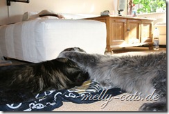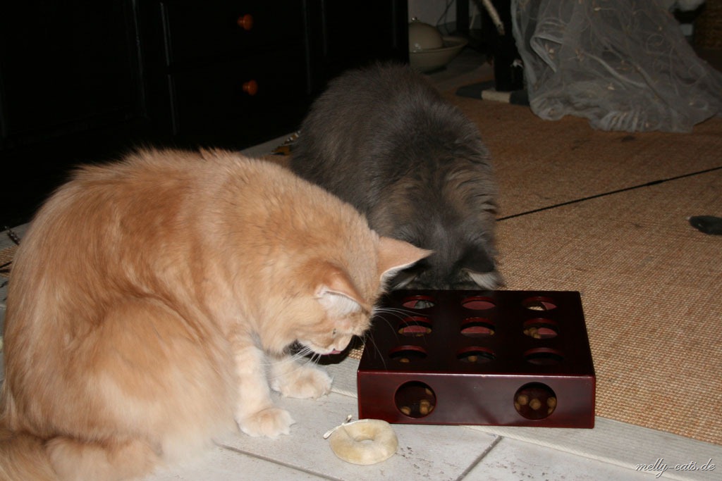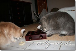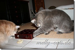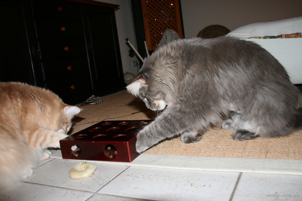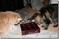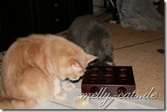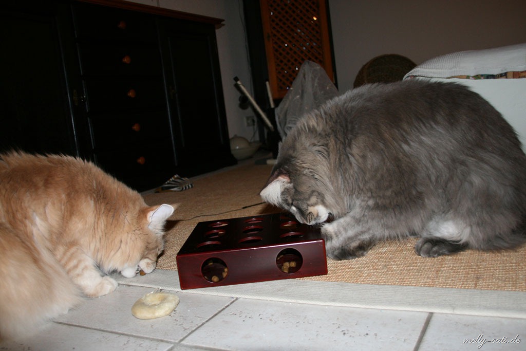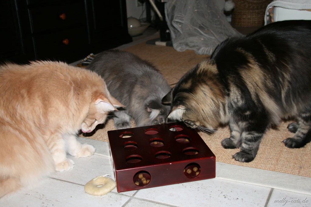 neben Spiel und Aktion sollen sich die Drei auch mal ein wenig geistig beschäftigen. Das hat sogar heute das geklappt, obwohl Carry das Spiel noch gar nicht kannte. Carry hat es sofort raus gehabt, wie man an das Leckerchen kommt