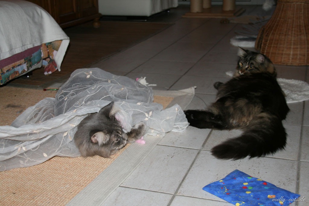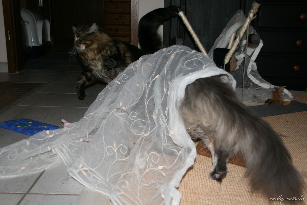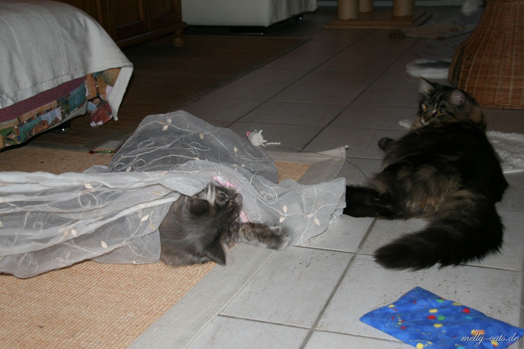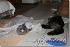 Hier ist alles in bester Ordnung. Aragon und Ellron sind zur Zeit außer Rand und Band. Sie toben und springen und spielen miteinander, das mir beim zusehen echt das Herz aufgeht. So hab ich Azrael und Aragon nur zu ihren jungen Zeiten kennengelernt. Vielleicht brauchte Aragon wirklich etwas länger, um wieder der Alte zu werden ;), es war ja auch alles ein bisschen viel für so eine kleine Katerseele. Erst verstirbt Azrael und dann wird ihm noch so ein Jungspunt einfach vor die Nase gesetzt. Er liebt es mich zu veräppeln und ständig zur Balkontüre zu gehen und sobald ich aufstehe und da bin, dann rennt er weg ;). Gerade hüpft er sogar seitlich vor Ellron rum um ihn zum spielen zu animieren