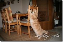 Mir ist gerade mal aufgefallen, dass ich schon lange nichts mehr in meine kleines Katzentagebuch geschrieben habe. Deshalb hier mal ein kleines Update. Aragon entwickelt sich zu einem bösen Kater Flugakrobaten. Er hat entdeckt, dass man auf Schränke springen kann. Leider sehr zu unserem Leidwesen :( , da der Wohnzimmerschrank Glasvitrinen hat und wenn der Herr mit seinen ca. 10 kg Kampfgewicht da raufhopst, dann vibrieren alle Gläser im Schrank und der Schrank auch. Es ist auch genau der Schrank, wo der Herr schon die Lampen von abgebissen hat :(.  Letztens ist er auf den Schlafzimmerschrank gehopst und dort steht dieser Wäschekorb mit dem die beiden ab und zu spielen. Tja, was soll ich sagen, als ich Abends nach Hause kam, lag der Wäschekorb auf dem Boden und Aragon war irgendwie völlig verstört. Eigentlich ist es mir ja egal , wenn er auf die Schränke hopst, aber immer einen Kollateralschaden, da hab ich irgendwie keine Lust drauf :(. Außerdem kenn ich meinen Herrn, er ist so ein Kandidat, der sich beim runterspringen alle Knochen bricht. Er ist nämlich so grazil, wie eine Elfe oder wie nennt man nochmal das große graue Tier mit dem Rüssel???