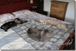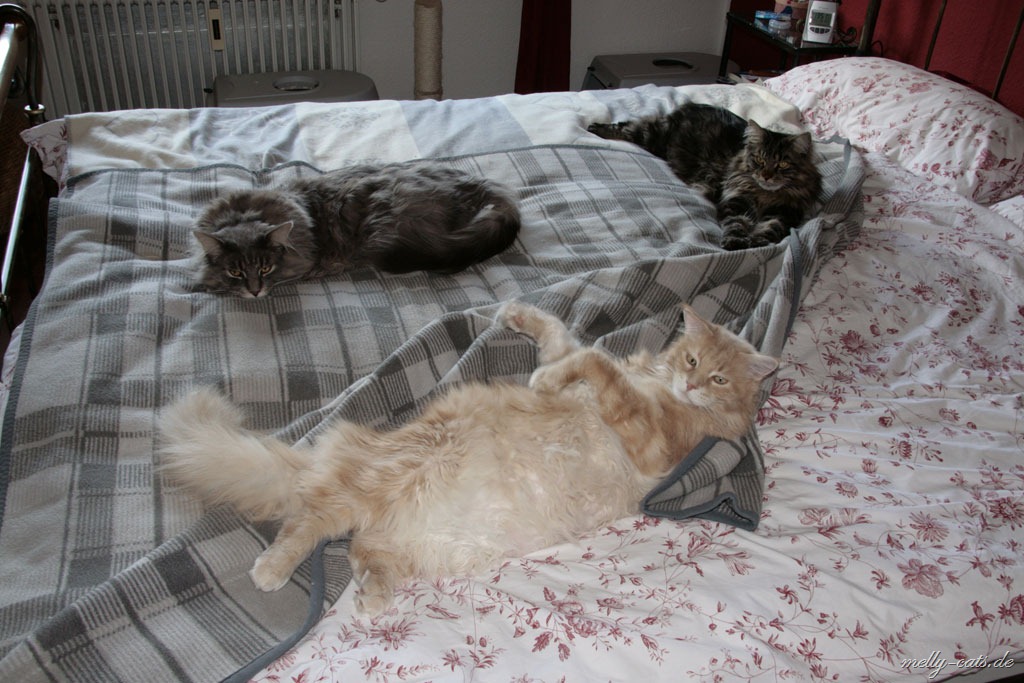 . Ich kann auch seit ein paar Wochen eine kleine Veränderung zwischen ihnen feststellen. Aragon spielt wieder viel mehr, Ellron kommt wieder viel häufiger sich seine Schmuseeinheiten abholen und Carry lässt sich fast ohne fauchen und schlagen und kratzen bürsten. Ich hege die Vermutung an, das Carry jetzt richtig angekommen ist und sein neues Zuhause akzeptiert hat und auch Ellron und Aragon haben sich beruhigt. Man darf ja auch bei dem ganzen nicht vergessen, das die letzten 1 1/2 Jahre für Aragon ganz schön heftig waren