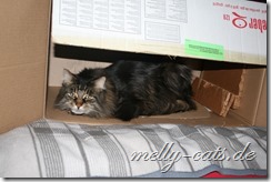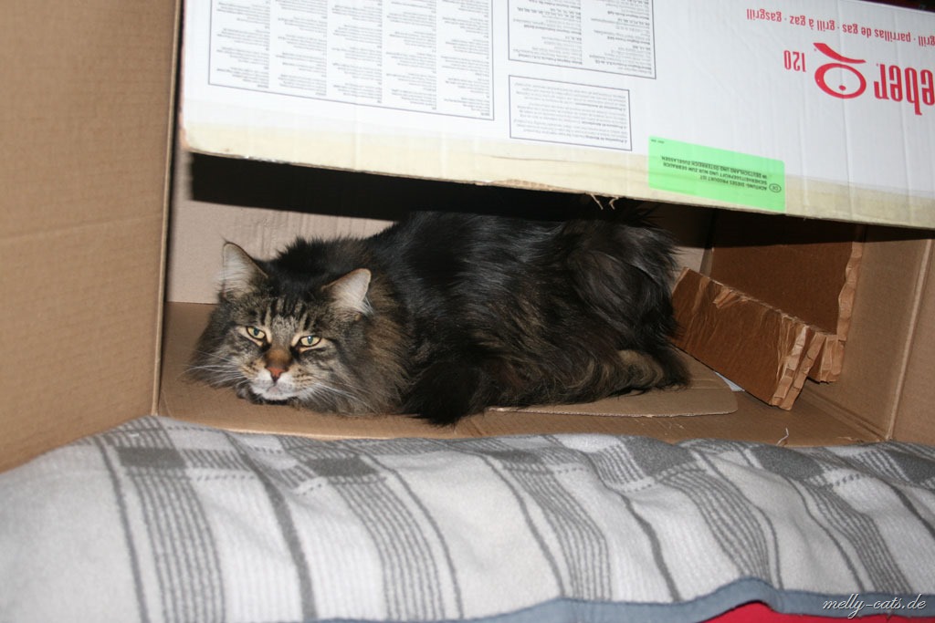 Gestern hatte ich auch noch einen tollen Schlafplatz entdeckt. Mein neuer männlicher Dosi wollte nämlich unbedingt grillen und holte einen großen Karton aus seinem Zimmer. Zuerst hab ich Angst gehabt, weil da so ein langer Spieß mit bei war. Nicht das er mich aufspießt und auf den Grill legt *grüblerichguck. Aber dem war zum Glück nicht so, also konnte ich die Gunst der Stunde nutzen und mal ein wenig Augenpflege betreiben