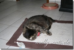 Gesagt getan, ich kam leider wieder in einen Kennel (boha,wie ich diese Dinger hasse) und meine erste Mama, die mich auf die Welt brachte, hat mich kurzer Hand zu den Melly-Cats gebracht. Vorher haben wir aber noch einen ganz doofen Autostop eingelegt….wir waren bei so einem Mann mit weißer Hose und blauem Polo-Shirt…wie sich rausstellte, hat er alles an mir untersucht und mir auch noch so ein blödes Piksdings in den Hinterbatzen gehämmert….jawohl gehämmert, dass fand ich gar nicht schön.