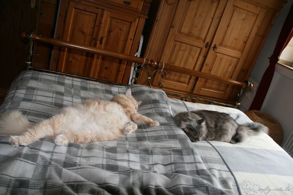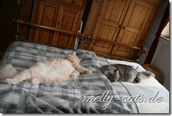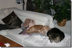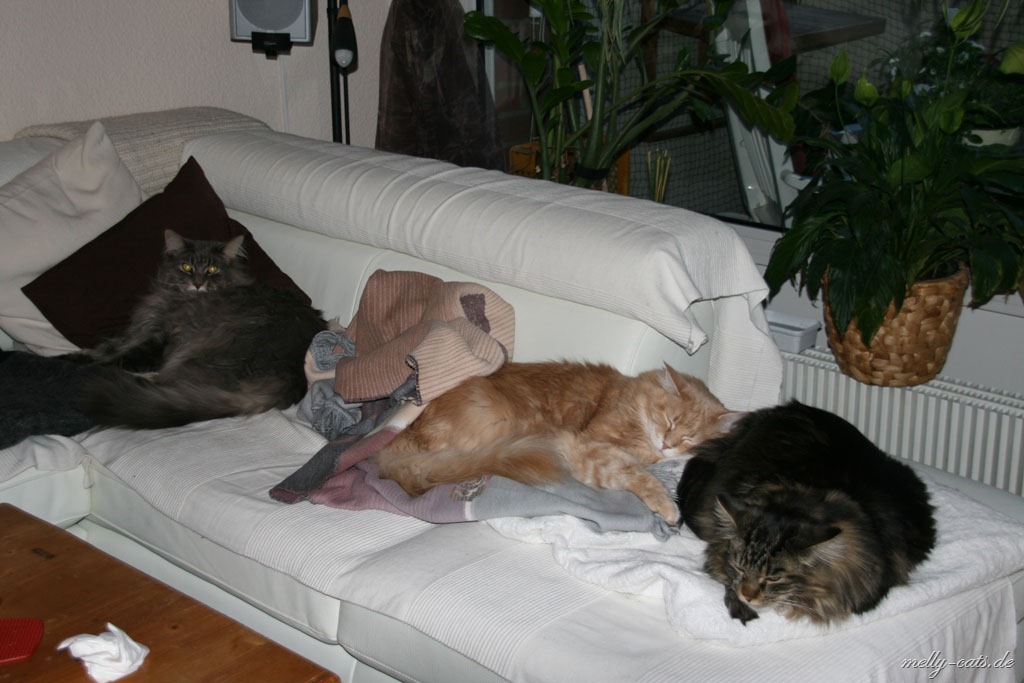 und Freitagabend. Am Freitag hatte ich mal Glück, da lagen alle 3 zusammen auf der Couch. Ist ein seltenes Bild, da Aragon und Carry sich die vor ein paar Wochen noch mächtig angezickt hatten. Sie zicken zwar immer noch mal, aber bei weitem nicht so heftig, wie sie es getan hatten. Ich gebe den beiden seit ca. 2 Monaten Chamomilla D30 und es wirkt .